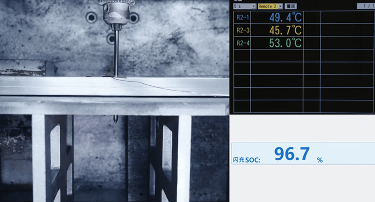 而在第二代刀片电池上,比亚迪又进一步提升了试验的难度:一边闪充,一边针刺。