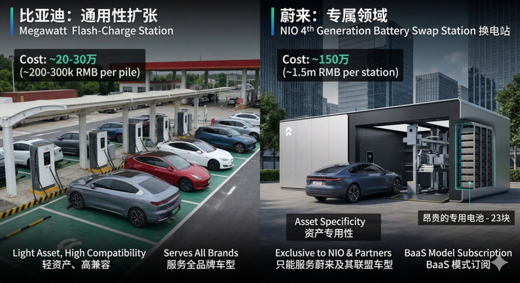 反观蔚来,它正处于一种"专属领域"的困局中。一座四代换电站包含23块昂贵的专用电池和复杂的全自动吊装系统,资产专用性极高,只能服务蔚来和那几个换电联盟的朋友。这种"重资产、专属性"决定了它必须押注当地的蔚来销量——上海这种一线城市,单站一天能跑100多单,赚得盆满钵满;但一到县域市场,一天不到20单。当资本进入存量博弈,比亚迪可以用低成本桩群迅速完成"县县通",而蔚来每建一座站,都像是在进行一场高风险的区域性投注。