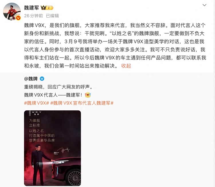 几天后,魏牌官方宣布:魏建军正式出任魏牌V9X代言人。