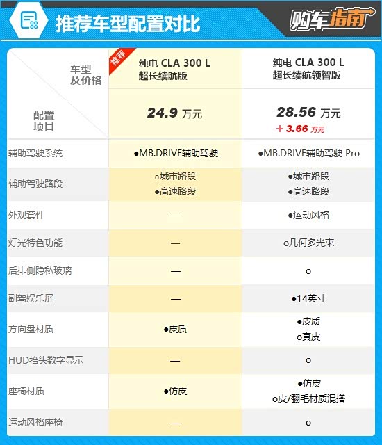 从全系配置来看,高配车型与推荐车型相比,辅助驾驶系统升级为MB.DRIVE辅助驾驶 Pro,并标配城市路段的辅助驾驶。同时还新增运动风格外观套件、14英寸副驾娱乐屏,并提供几何多光束灯光特色功能、后排侧隐私玻璃、HUD抬头数字显示等配置的选装。但是售价要增加3.66万元,综合性价比并不高。