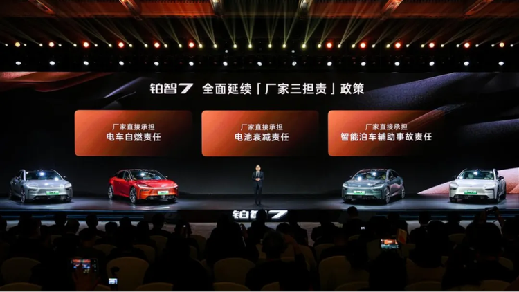 此外,铂智7还为用户提供三电终身质保、厂家三担责(电车自燃、智能泊车事故、电池衰减均由厂家担责)等保障,从购车到用车全程兜底。