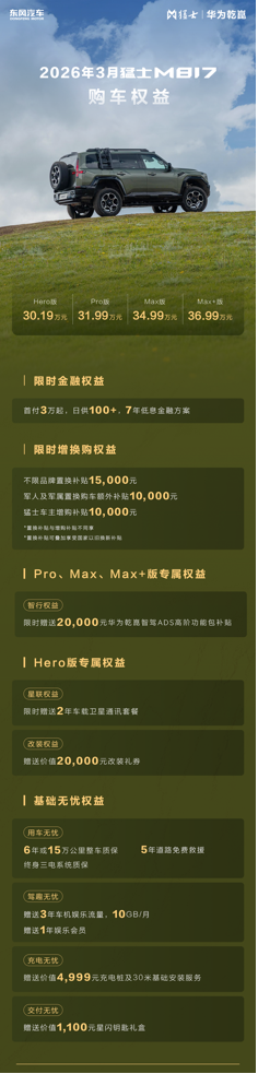 亮眼的销量成绩印证了市场的高度认可,为让更多消费者轻松解锁城野无界的出行体验,猛士汽车重磅推出猛士M817三月专属购车权益,涵盖限时金融权益、限时增换购权益、Pro、Max、Max+、Hero版专属权益和基础无忧权益等,多重钜惠豪礼层层加码,覆盖购车、用车、玩车全场景,下探豪华智能越野门槛,让春日入手硬核座驾变得更轻松。