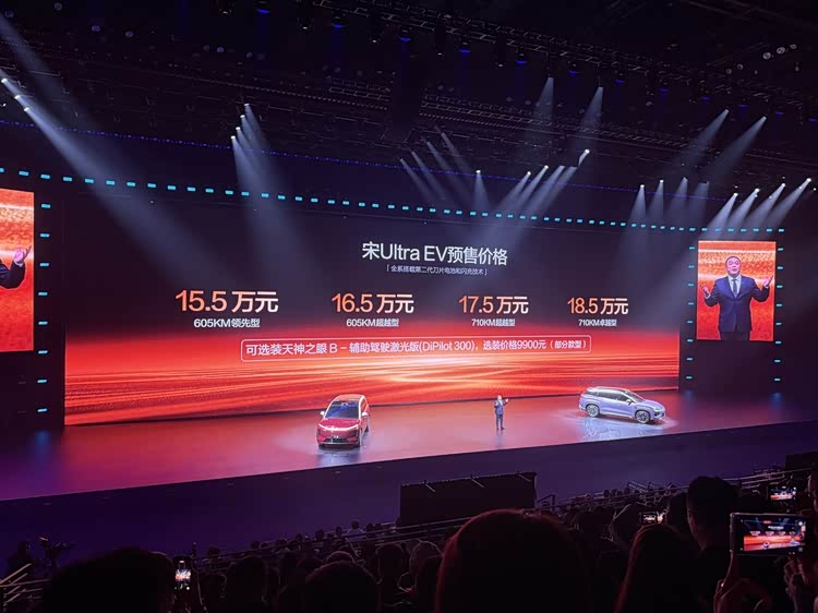 宋Ultra EV作为王朝网首款B级纯电SUV,预售价15.5万元起,将于3月底上市。搭载第二代刀片电池和闪充技术,CLTC续航可达710公里,可选装天神之眼B激光雷达版(选装价9900元)。