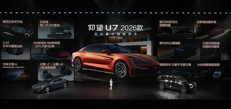 仰望U7 2026款售价65.8万元起,首搭全新升级的第二代刀片电池,EV版电池容量增至150.01kWh,CLTC纯电续航提升至1006km,PHEV版综合续航达1100km。在闪充技术加持下,可实现“5分钟充好、9分钟充饱、零下30度只多3分钟”的极致快充体验,让每一次出行都更加高效从容。