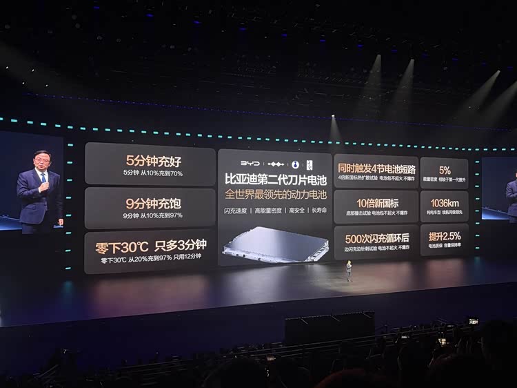 王传福特别强调,去年发布的兆瓦闪充是“量变”,将峰值功率推向新高度;而 今天的闪充技术是“质变”,实现了从头到尾全程快,真正把用户的充电痛点完美解决 。不仅如此,第二代刀片电池在能量密度上也实现了逆势提升,相较第一代提高了5%,这使得搭载该电池的车型续航里程轻松突破千公里。例如,腾势Z9GT的CLTC续航达到了1036公里,仰望U7也达到了1006公里 。