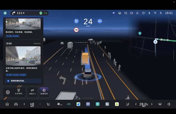 有了VLA大模型的赋能,全新蓝山拥有了拟人化的推理思考能力,真正做到了“听得懂、会思考、能交心”。凭借深度的场景感知,蓝山不仅能识别物体,更能像真人一样主动“理解意图”,在盲区汇入、掉头或路边临停等风险场景下,能够以“防御为先”的直觉提前感知风险并从容避险。即便身处施工区域、极窄街巷等极限环境,它也能像经验丰富的“老司机”一样灵活预判,主动规划出最优通行路径。不仅如此,为了建立人与科技之间的深层信任,全新蓝山还通过CoT思维链推理卡片将辅助驾驶逻辑“可视化”,在屏幕上直观展示“它在做什么”以及“为什么这么做”,彻底消除了用户对未知的焦虑,也让领先的智能科技更有“人味儿”。