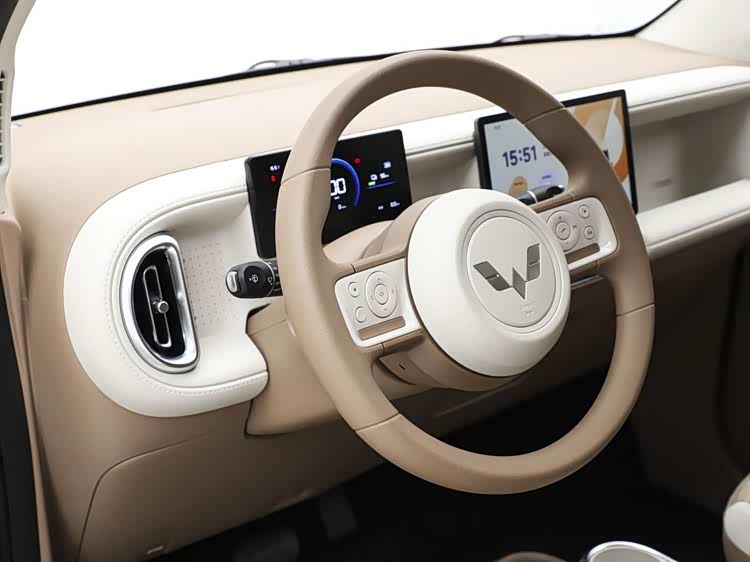值得一提的是,第五代宏光MINIEV车内的设计也很“考究”,焦糖奶油色的内饰设计可以说跟外观设计形成了呼应,坐进车里能让人瞬间放松,副驾驶前面还有一个“百变造景空间”,你可以根据自身需求来进行设计——放手办、摆盲盒,可以说进一步满足了年轻人个性化的审美需求。
