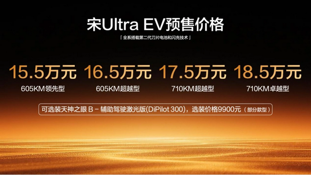 宋Ultra EV有两个续航版本,605km和710km,一般家用的话,入门版就够用。全系搭载云撵C,说简单点就是软硬可调,辅助驾驶层面没有激光雷达的可以选装,不太依赖辅助驾驶的人群则可以买素车。如果预算在15万左右,喜欢纯电车型的消费者,倒是可以去试试,对比一下,宋Ultra EV的竞品包括不限于深蓝S07、星途ET5等车型。