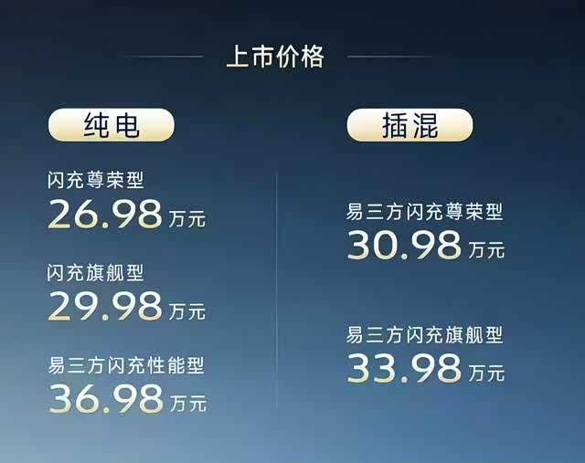 15.99万起!一共四个车型,顶配17.99万。中高配车型纯电续航710km+闪充,入门版整备质量2040kg,中高配2080kg,有兴趣的可以算一下重量和电池包的关系等。