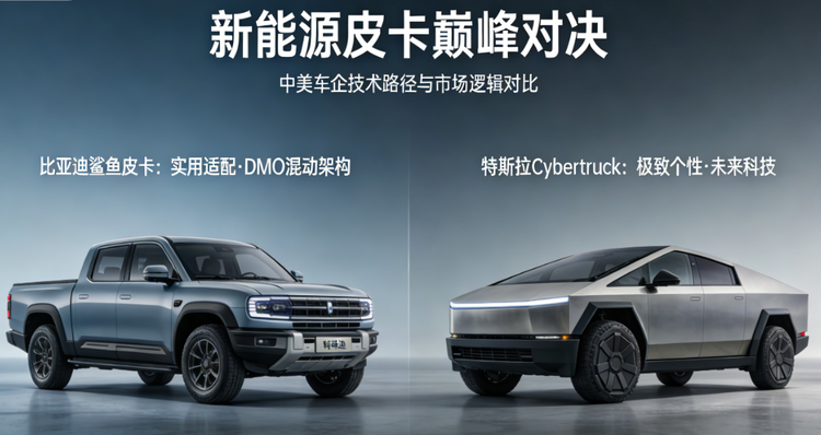 当比亚迪鲨鱼皮卡携DMO混动架构入局,遇上特斯拉 Cybertruck(参数|询价)的科幻硬核,全球新能源皮卡赛道迎来巅峰对决。两者一个深耕实用适配,一个主打极致个性,背后是中美车企截然不同的技术路径与市场逻辑,这场较量不仅关乎两款车的胜负,更折射出全球皮卡电动化的未来走向。