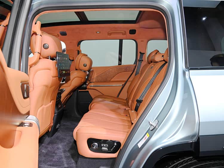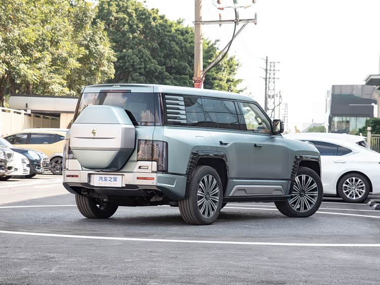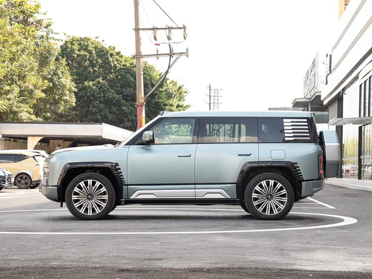 侧面造型方面,车顶线条比较平直,有着浓浓的硬派气息;而且车顶还营造出了悬浮式造型,给人的感觉比较时尚;腰线采用了贯穿式设计,让视觉效果显得修长大气;门把手采用的是弹出式设计,能够起到降低风阻的作用;轮眉和侧裙部分的造型看起来都比较硬朗,凸显了力量感;轮毂采用的是22英寸多辐式熏黑造型,风格显得比较大气,而且标配了电动侧踏板,方便乘客上下车。