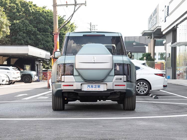 尾部造型方面,外挂式的备胎罩有着比较强的力量感;尾灯组的造型比较粗犷,内部集成了点阵式光源,点亮后有着比较强的辨识度;下包围部分配备有粗壮的灰色饰板,两侧还集成有扁平的雾灯。