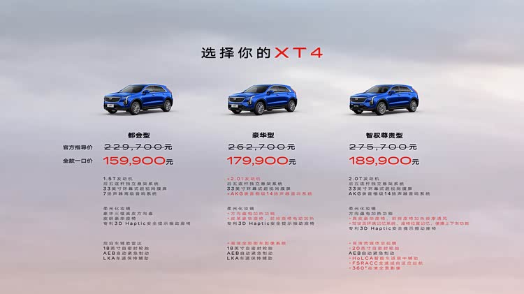 【新车上市】日前,新款 凯迪拉克XT4(参数|询价)正式上市,新车共推出都会型、豪华型、智驭尊贵型共3款车型,指导价22.97-27.57万元,全款一口价区间15.99-18.99万元,并且限时升级L2级驾驶辅助。