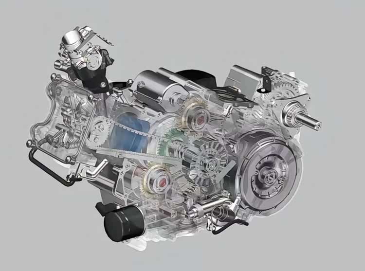这种设计通常只出现在运动型跨骑摩托车上,通过让发动机充当车架的一部分,既降低了重心,又提高了车架刚性。