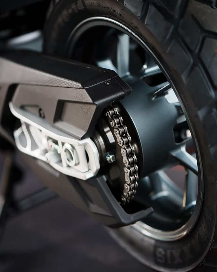 此外,剑齿虎最大的亮点就是它舍弃了传统的皮带传动,而采用跨骑车款的链条传动,不仅增强了动力传输效率和耐用性,而且在野外环境下也更容易维修。