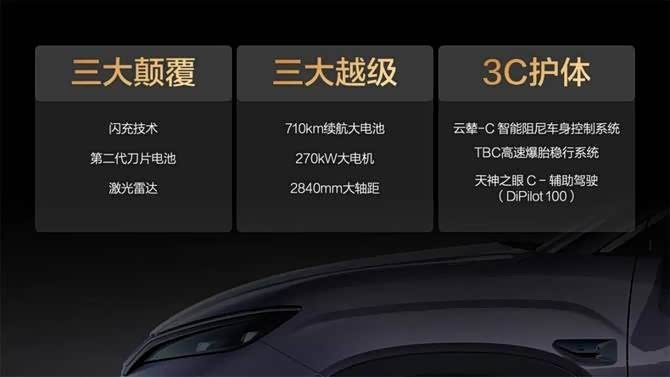 奢适配置方面,宋Ultra EV诚意拉满,全系标配多项实用配置,兼顾舒适性与便利性。内饰采用大面积软质包裹,走简约轻奢路线,搭配悬浮式中控屏、全液晶仪表和W-HUD抬头显示,信息读取更安全便捷;双50W手机无线充电板可满足主副驾同时快充,全车座椅支持通风、加热和按摩功能,女王副驾、敲击解锁前备箱等细节设计,进一步提升驾乘体验。智能驾驶层面,新车可选装激光雷达,搭载天神之眼B高阶智驾系统,支持无图城市领航辅助和高速NOA,基础版配备L2+级智能驾驶功能,同时比亚迪承诺对智能泊车功能的事故“全兜底”,为用户带来更安心的智能出行体验。此外,新车还配备云辇-C智能阻尼车身控制系统、TBC高速爆胎稳行系统等安全配置,全方位守护出行安全。
