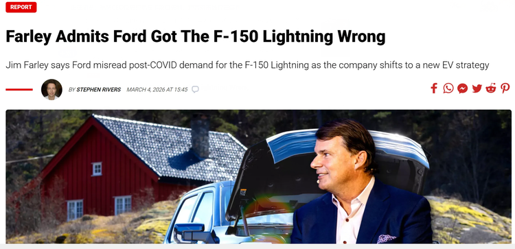 福特公司CEO吉姆·法利就旗下纯电皮卡F-150 Lightning的项目失利进行反思,明确表示公司在该项目上存在对市场需求和行业发展趋势的明显误判,坦言燃油车时代的思维惯性成为企业发展纯电车型的重要掣肘。