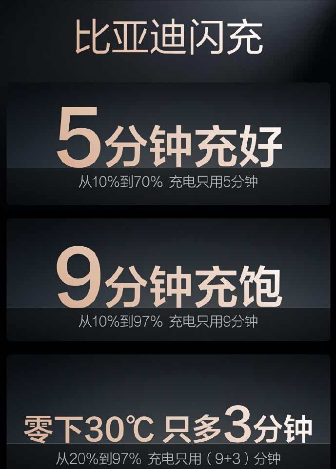 据官方数据,新电池配合闪充桩可在5分钟内完成10%-70%补能。快充本身并不新鲜,但10%-70%仅需5分钟、10%-97%仅需9分钟的成绩,确实前所未有。比亚迪宣称这创下了"量产车最快充电速度"的世界纪录。