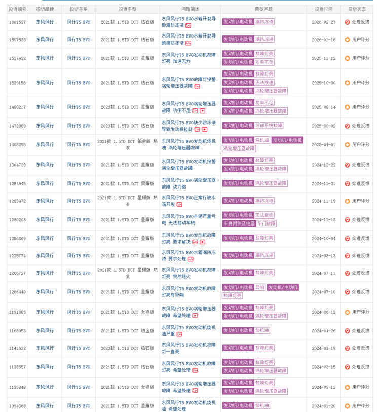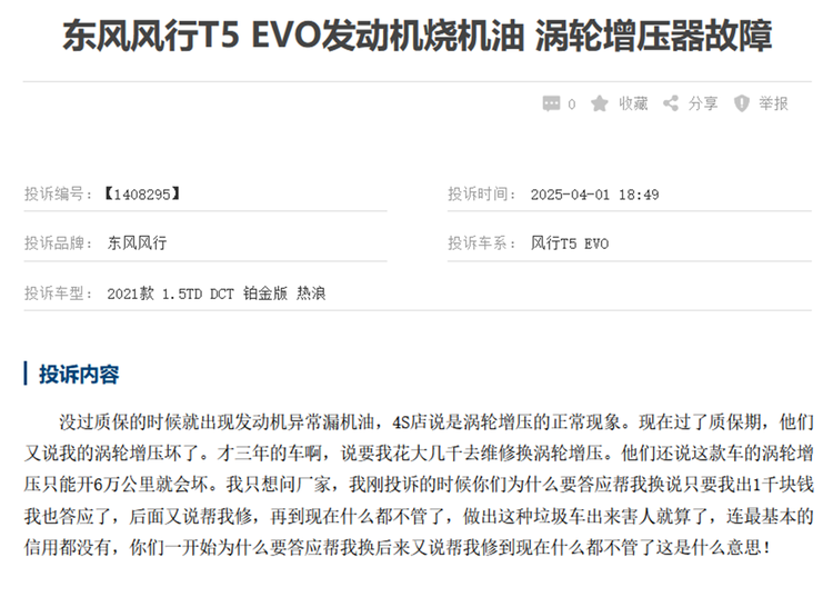 但根据某汽车质量相关的网站上的投诉数据显示,搭载沈阳航天三菱4A95TD 1.5T发动机的部分车型,核心部件接连爆发批量性故障,烧机油、涡轮增压器失效、发动机故障灯异常点亮等问题集中出现,大量车主陷入用车困扰与维权困境。在315品质监督的关键节点,风行T5 EVO部分车型的发动机危机,不仅是单一车型的质量问题,更戳中了部分自主车企“重营销、轻品控、重外观、轻服务”的行业短板,为汽车消费品质升级敲响了警钟。