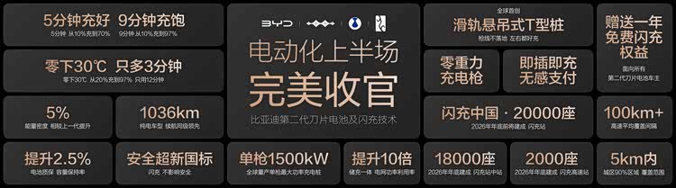 比亚迪六年磨一刀,正式推出第二代刀片电池,通过打造“锂离子高速通道”和“全温域智能热管理系统”,既实现了闪充,也对电池寿命几乎没影响。同时比亚迪还全新开发了闪充桩,单枪充电功率达1500kW,成为全球量产单枪最大功率充电桩!