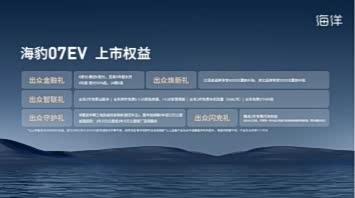 海豹07EV集第二代刀片电池、闪充、云辇-C智能阻尼车身控制系统、“天神之眼”辅助驾驶系统等硬核科技于一身,加之超百项全系标配,将越级配置拉满,用人人可享的好技术和人无我有的好体验,陪大家共同奔赴出众生活,以都市新ICON的风范,树立中大型轿车市场新标杆和出行新标准。