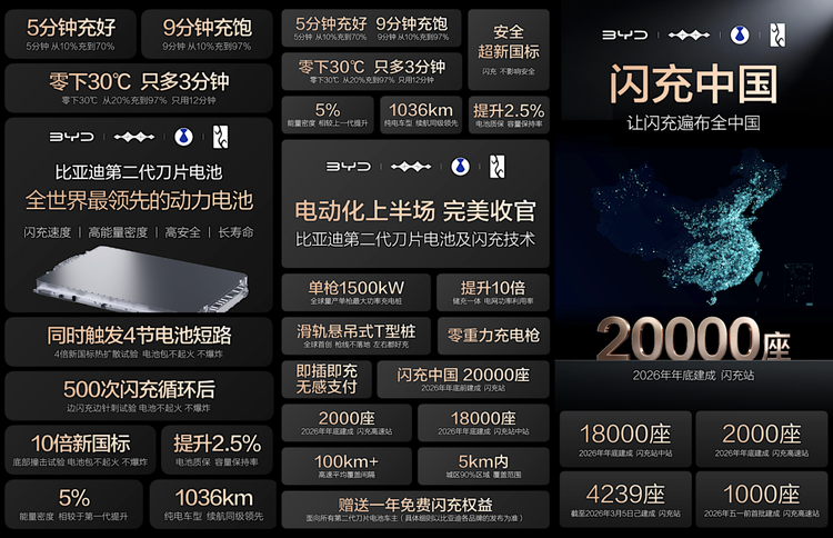 比亚迪发布了第二代刀片电池和闪充等技术,磷酸铁锂电池可实现超1000公里续航,并且从10%充至97%电量只需9分钟,在零下30℃环境下仅增加3分钟;电池质保进一步提升,8年15万公里可保持72.5%以上电量;承诺2026年投入2万座自建闪充站,单枪最大功率1500kW,高速公路平均每100公里布局一座,城区90%区域实现5公里覆盖,这将显著削弱插电混动、增程和固态电池等技术路线的优势。