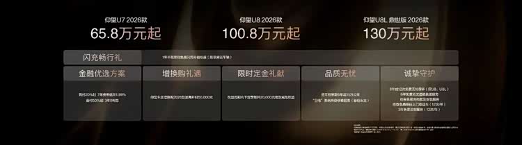 近日,比亚迪仰望2026款三款新车重磅齐发,售价跨度65.8万-130万,全系标配第二代刀片电池与闪充技术,实现9分钟满电,零下30℃充电仅多3分钟。三款车型各有定位,U7 65.8万起,坐拥1006km纯电续航与1300匹马力,云辇-Z/A悬架双选,是性能旗舰;U8 100.8万起,完成12处舒适升级,续航提升20.5%,补能倍率翻三倍;U8L鼎世版130万起,搭载应急浮水自动激活等三大安全配置。另外,老款车型可通过OTA解锁新安全功能。全系标配硬核技术,覆盖性能、舒适、顶级安全三大赛道,仰望是必要立住国产高端新能源标杆。