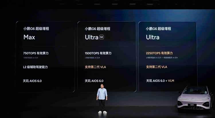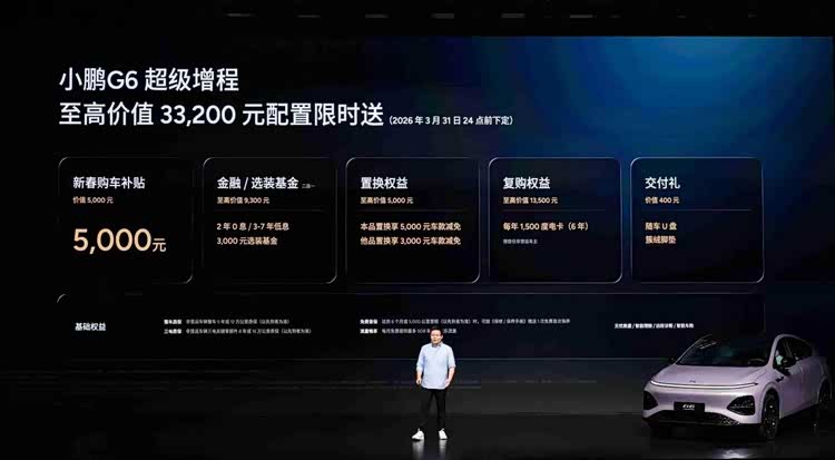 (2026年3月6日,广州)小鹏汽车举行小鹏G6超级增程上市发布会,新车定位六项全能AI增程SUV,以“六项全能 一步到位”为核心,凭借同级综合续航第一、同级补能速度第一、同级车端有效算力第一、同级最强底盘系统、同级最强主动安全和同级得房率第一的六大核心优势,打造真正满足用户全场景需求的国民车。本次发布小鹏G6超级增程1704 Max,官方指导价为18.68万元,用户可选装两个智能升级包,加购12,000元升级为Ultra SE版本、加购20,000元升级为Ultra版本。即日起至2026年3月31日24点前下定小鹏G6超级增程,可享至高价值33,200元限时权益礼包,包括5,000元新春购车补贴、至高价值9,300元金融/选装基金(二选一)、至高价值5,000元置换权益、至高价值13,500元复购权益和价值400元交付礼。