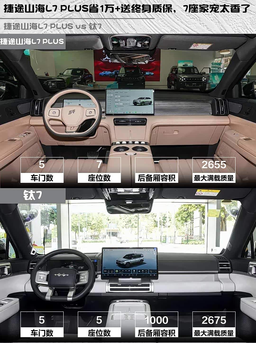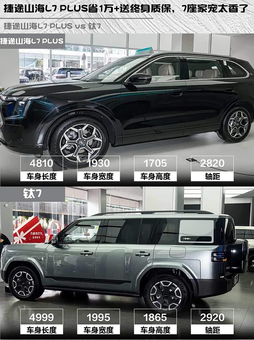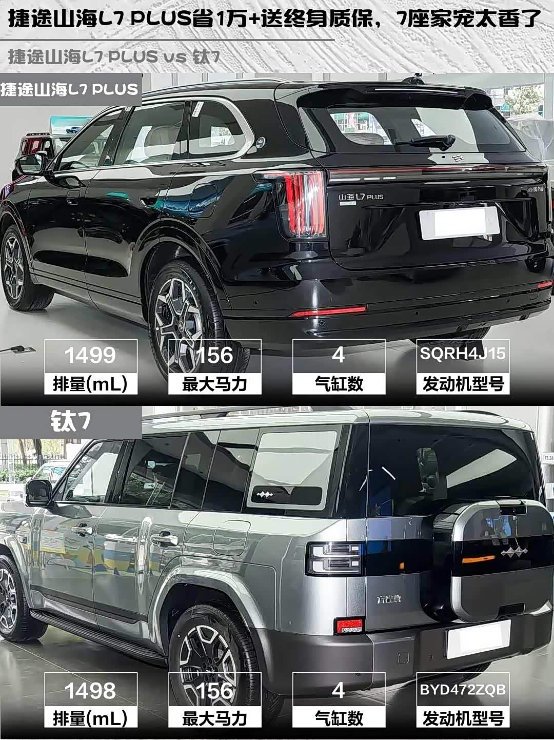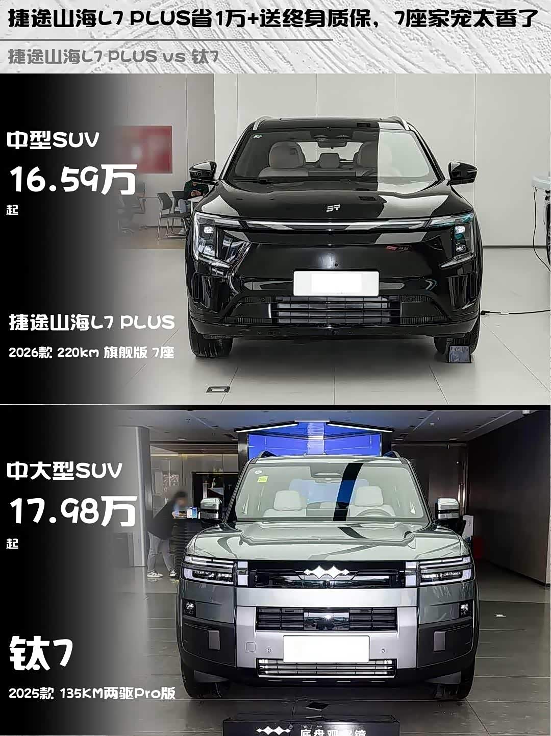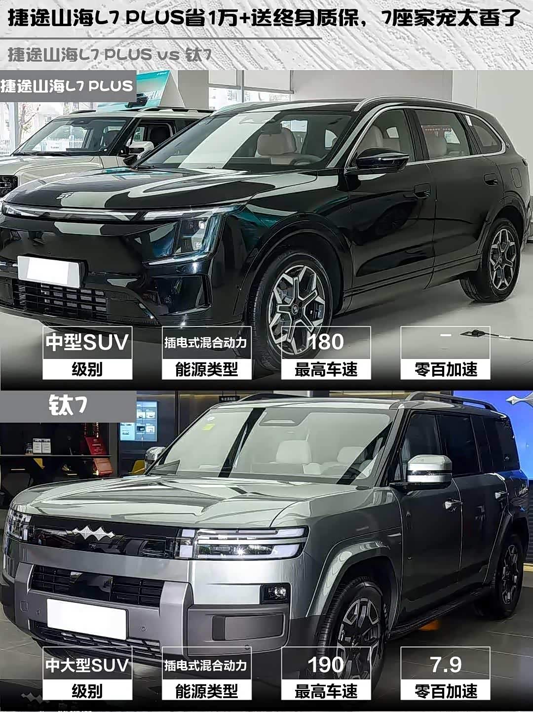 最近在选混动SUV的朋友看过来!今天深度对比两款热门车型—— 捷途山海L7 PLUS(参数|询价) 2026款 220km旗舰版7座和钛7 2025款135KM两驱Pro版,看完你就知道哪款更适合你!🔥
