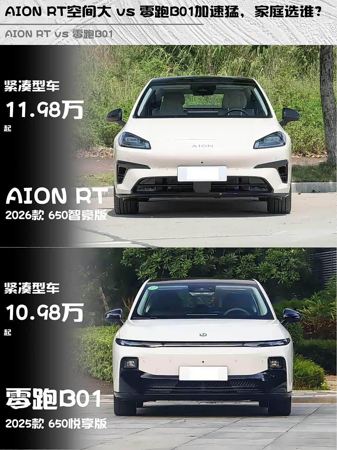 最近在选15万级纯电家轿的朋友看过来!今天深度对比两款热门选手—— AION RT(参数|询价) 2026款 650智豪版和零跑B01 2025款 650悦享版,实测干货分享👇