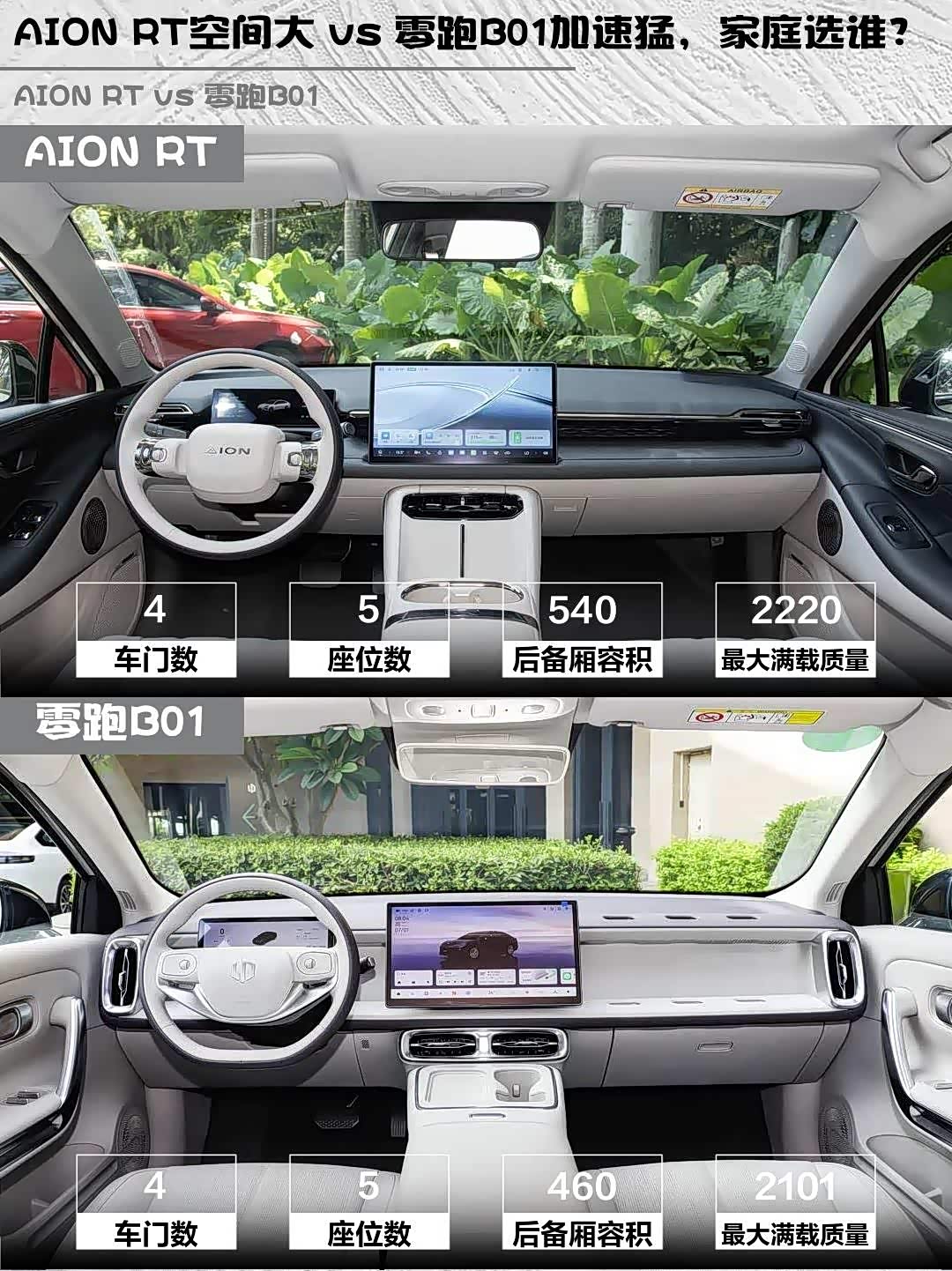 AION RT车身尺寸486518751520mm,后备箱540L堪称搬家神器,后排装儿童座椅还能跷二郎腿;零跑B01虽然车身稍小(4770mm),但后驱布局让后备箱深度优秀,460L容积+纯平地板也很能装。不过AION RT的后排头部空间更宽裕,溜背设计对高个子更友好~