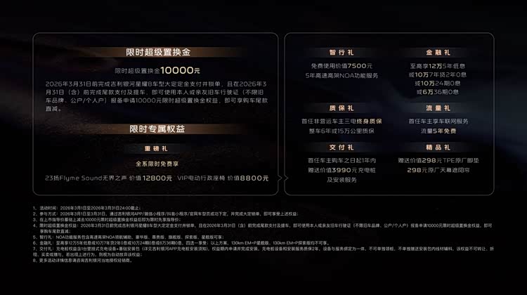 一台5米长的轿车,和3L级的油耗,这两个曾经矛盾的特性,在星耀8身上实现了共存。它用原生架构的优势,证明了“大块头”不一定都是“油老虎”。它既能装得下一家人的诗和远方,也不用让车主在每次加油时心疼钱包。这其实就是我们一直在寻找的那个标准答案:在享受C级车带来的从容空间和行政级座椅的舒适时,不必为能耗付出额外代价。目前正值2026年3月份的限时购车季,入手星耀8不仅能享受至高10万24期0息的金融礼,首任车主还能获赠充电桩及安装服务。可以说,关于大空间插混轿车的所有想象,星耀8用5米车长和3L油耗这道题,给出了一个高分解答。