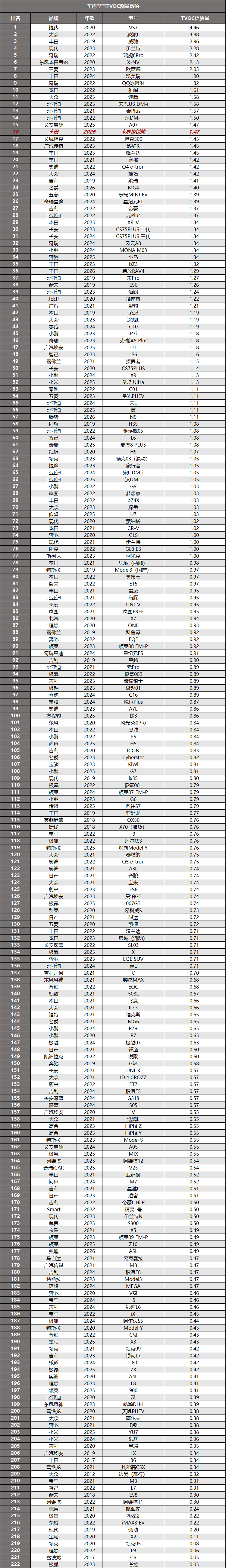 车内除了甲醛之外,TVOC也是重要的有毒有害气体、它是造成车内味道浓重的主要原因之一。TVOC是指空间内所有有机气态物质的总称,例如苯类、烷类、芳烃类、烯类……这些有机物都会对人体健康造成伤害。 测试方法:将测试车辆在自然环境中,打开车门车窗进行完全通风;随后,将一根硅胶软管固定在司机头枕附近,模拟人呼吸位置;关闭车门车窗,将车辆停在恒温23±1℃的环境中密封静置16小时;使用盟莆安MP181型TVOC检测仪,从软管泵吸车内空气,直至数值稳定后,得出最终结果。