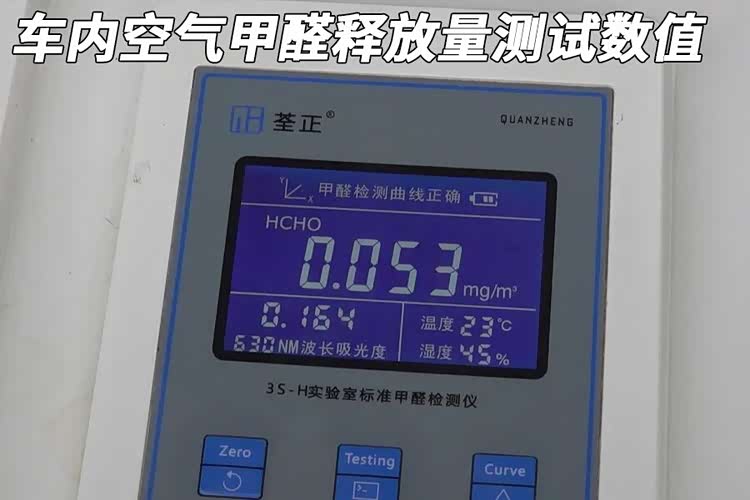 经过在23±1℃恒温环境中16小时的封闭,这辆车的车内空气甲醛释放量测量数值为0.053毫克每立方米。