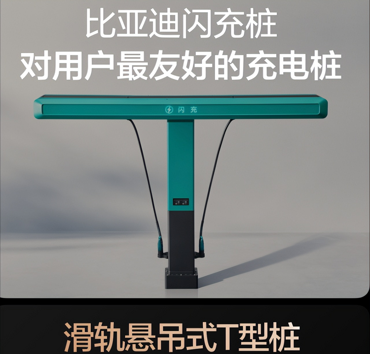 用过传统公共桩的都知道:枪重得像举铁,线脏得像拖把,流程繁琐得像考试。比亚迪闪充桩的"滑轨悬吊式T型桩"设计,直接终结这些痛点。