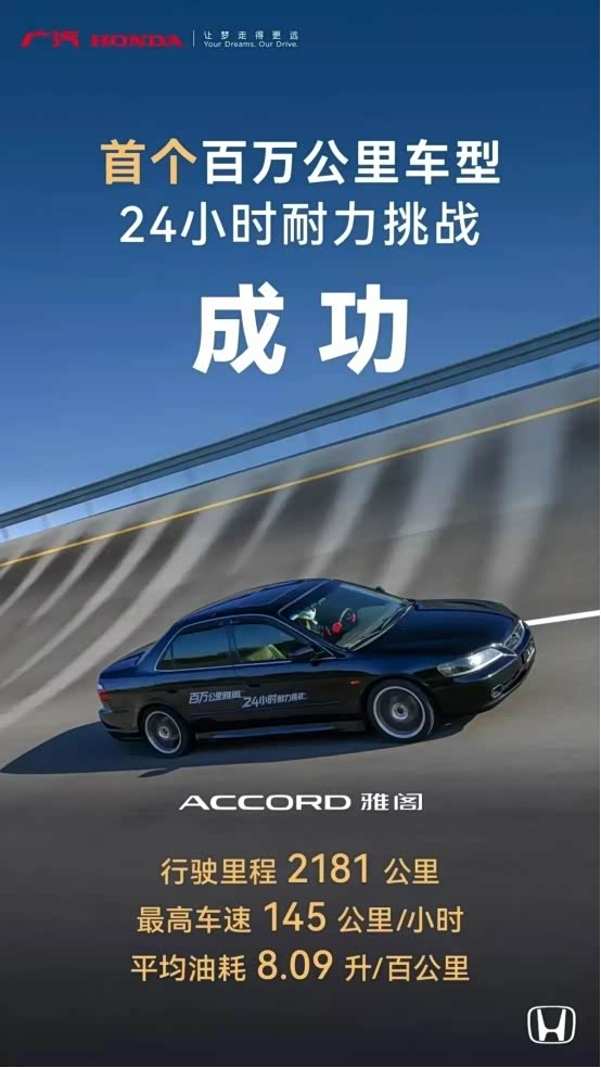 而这份陪伴的背后,其实是广汽本田二十多年如一日的“长期主义”。自1998年进入中国市场以来,广汽本田始终专注一件事:造用户最放心的车。这份坚持换来了实打实的成绩——雅阁在中国累计销量接近350万辆,稳稳站在“百万辆俱乐部”的C位。更让人惊讶的是,如今路上仍有70万辆车龄超过15年的雅阁在正常行驶。甚至有一台26年车龄、跑了近百万公里的第六代雅阁,曾在24小时高环极限耐力测试中一口气跑出2181公里,全程动力稳定,毫无掉链子。难怪网友调侃:“一车传三代,人走车还在。”