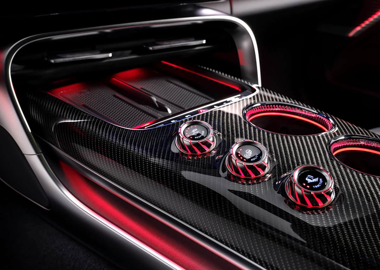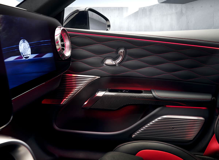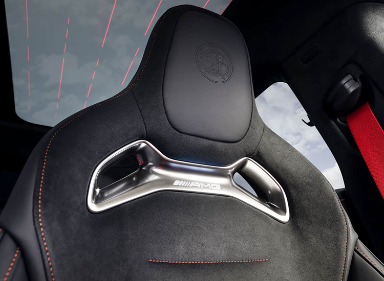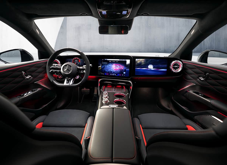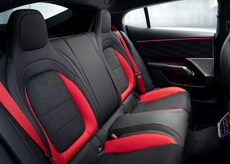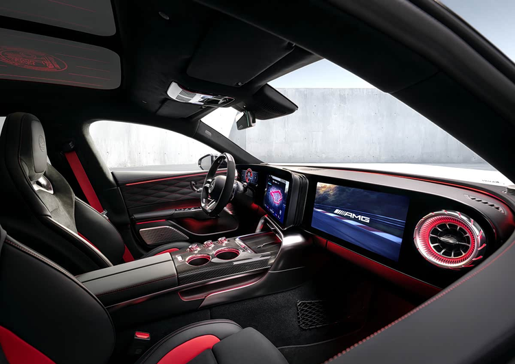 车辆的前排配备了一体式AMG高性能座椅,其设计借鉴了赛车桶椅的低坐姿与轻量化理念,旨在提供充分的侧向支撑。后排座椅提供了两种选择,用户既可以选择更强调独立乘坐感的双座布局,也可以选用传统的三人联排座椅。车顶配备了大尺寸的玻璃天幕,其特殊之处在于,天幕玻璃上可投射出AMG的发光徽章图案,并由一道贯穿车顶的条纹装饰进行点缀,强化了车内的运动主题。