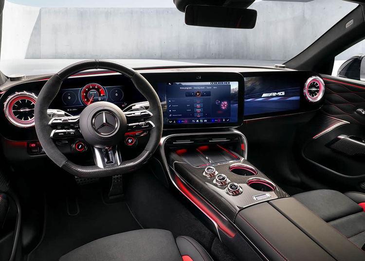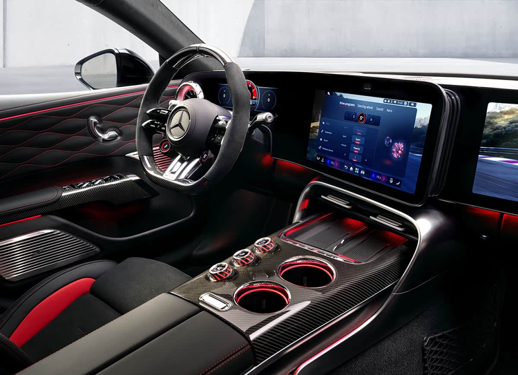 从公布的内饰图片来看,新车座舱大量使用了碳纤维材质与翻毛皮面料,辅以红色的氛围灯光和缝线点缀,营造出专注于驾驶的性能座舱氛围。车内最显著的特征是三块显示屏的布局,其中,面向驾驶者的10.2英寸全液晶仪表盘与略微倾向驾驶员一侧的14英寸中央触控屏采用了一体式曲面设计。副驾驶正前方还单独提供了一块14英寸娱乐屏。车机系统将搭载奔驰最新的MB.OS操作系统,并集成专为赛道驾驶开发的AMG TRACK PACE虚拟工程师程序,该程序可为驾驶者提供详尽的实时数据记录与分析功能。