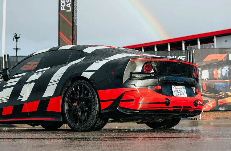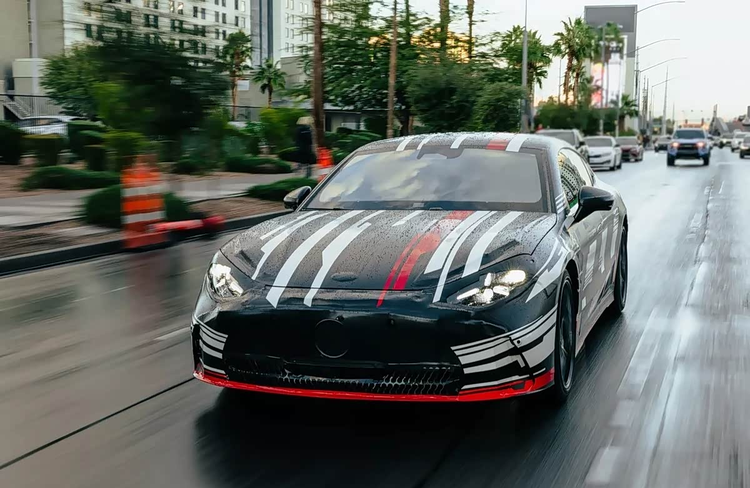 车尾部分,溜背造型进一步明确了其中大型GT轿跑车的定位。后备箱盖上配备了可电动升降的扰流板,并集成了用于提升下压力的格尼襟翼。尾灯组采用了圆环与横向光带相结合的设计,不过这可能仍非最终量产形态。车尾立体感较强,牌照框区域采用了内凹式设计。后包围的造型相对克制,没有使用过于夸张的扩散器,但能观察到为优化底部气流而打造的平整底盘。