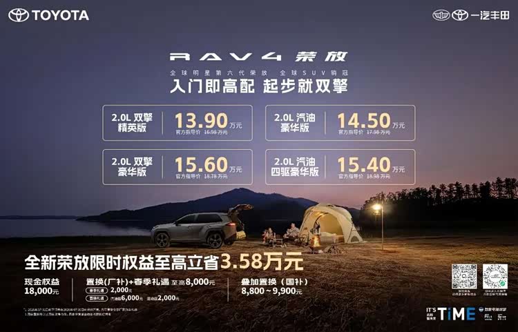 惊喜不止于价格,还有重重福利。2026年3月31日前下订荣放全系并在4月30日前开具发票的用户,即可享受一汽丰田提供的包括春季礼遇和置换补贴在内的至高8000元春日礼。这还不够,用户还可同步享受至高约万元的国家补贴。价格直降1.8万元、厂补至高8000元,再享受国补至高约万元,综合折算,购买全新荣放,真金白银至高立省3.58万元。
