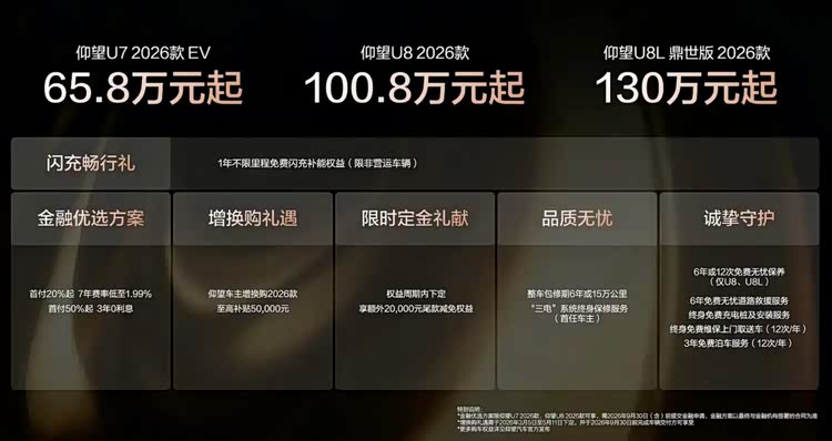 仰望品牌在本次发布会推出了2026款仰望U7、仰望U8、仰望U8L,售价分别是65.8万起、100.8万元起和130万起,以上新车均首搭第二代刀片电池。