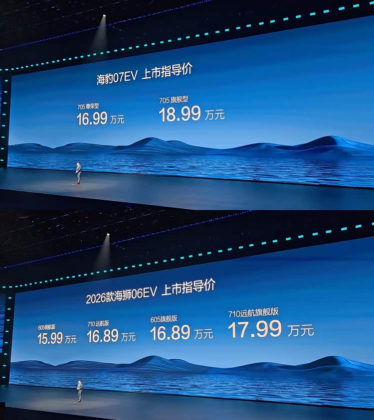海洋网在发布会上官宣了两款新车上市 ,它们分别是2026款海狮06EV与海豹07EV,售价分别是15.99-17.99万和16.99-18.99万,而比亚迪海洋网的全新旗舰轿车海豹08也在本次发布会上首次亮相。