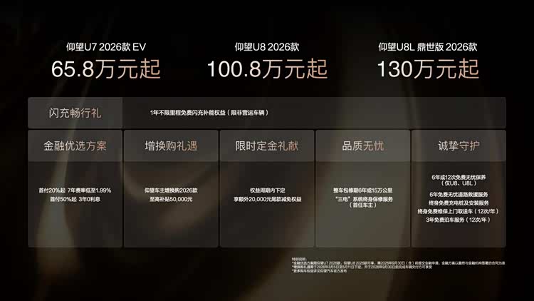 为回馈用户,仰望汽车还推出了丰厚的上市礼遇:2026年5月11日(含)前支付定金的用户,可享1年不限里程免费闪充补能权益(限非营运车辆);同时还有金融优选方案(首付20%起7年费率低至1.99%、首付50%起3年0利息)、仰望车主增换购至高50000元补贴、额外20000元尾款减免等多重福利,更有6年或15万公里整车包修、“三电”系统终身保修、终身免费充电桩及安装等品质无忧保障,让高端用车体验更省心。