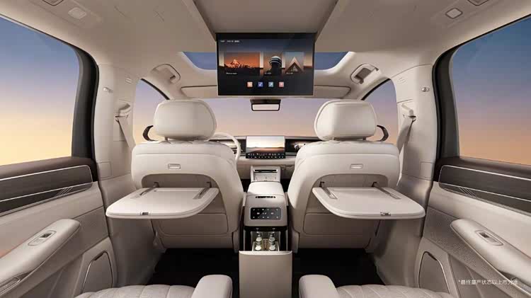 配置方面,新车提供了丰富的舒适性装备。第二排除了独立航空座椅,还配备了吸顶式娱乐屏、折叠小桌板以及车载冰箱。