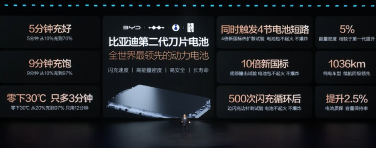 安全之外补齐性能短板,是比亚迪这次发布会上带来的另一个惊喜。之前大家对磷酸铁锂的印象很固定:安全够了,但性能差点意思。第二代刀片电池创新性的用上了磷酸锰铁锂复合正极搭配硅碳负极的全新体系,系统能量密度直接追上主流三元锂电池。看到CLTC超千公里续航,-30℃的极寒天气,电池容量保持率依旧超80%,冬天续航衰减严格控制在15%以内的数据的时候,估计很多人都松了一口气:这下终于两全其美了。