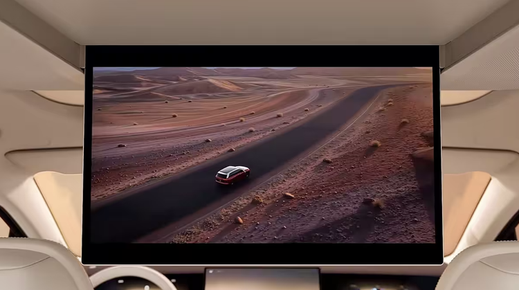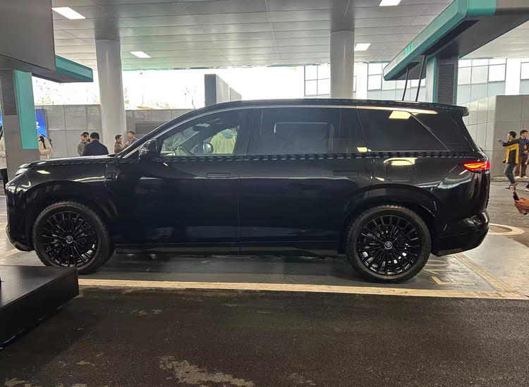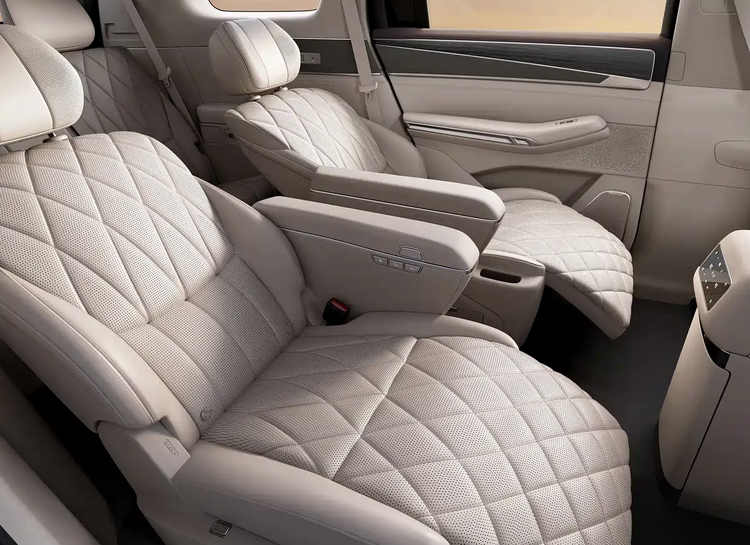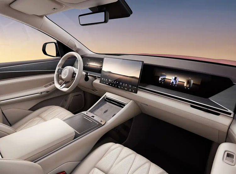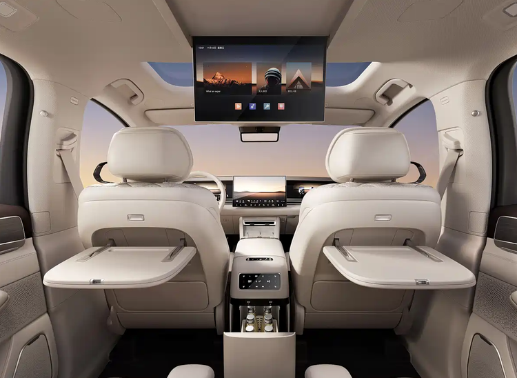 中控台下方设有无线充电面板与快捷物理按键,车门开关则采用电子按键设计,取代传统机械门把手。座椅布局为2+2+3七座形式,第二排配备双零压独立座椅,支持一键躺平,并集成大尺寸折叠屏、小桌板与车载冰箱;第三排座椅同样支持电动调节与加热功能,实现了全车乘客的舒适平权。