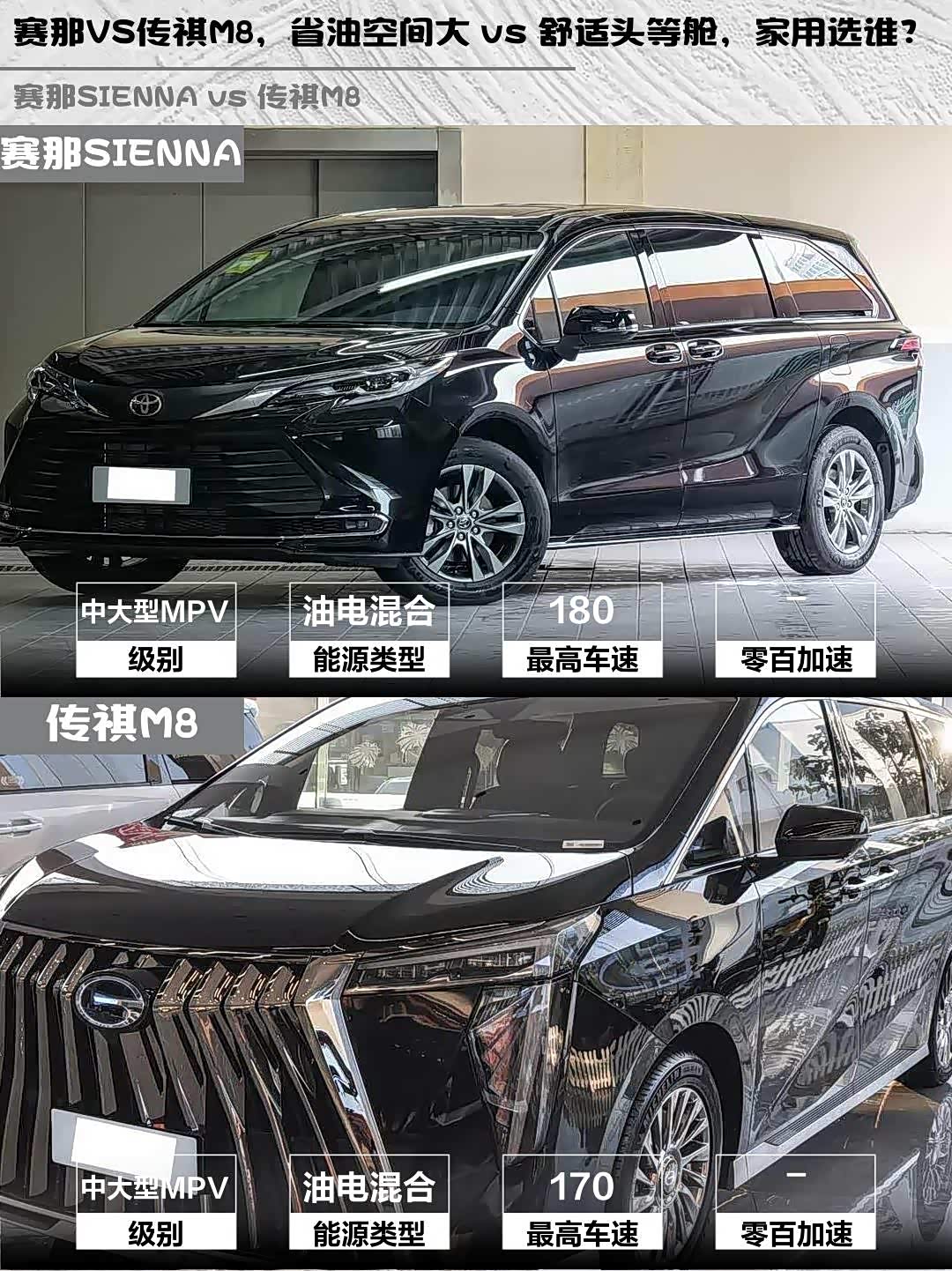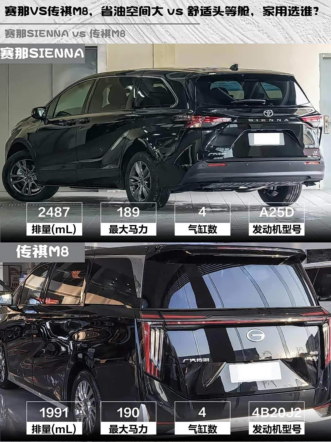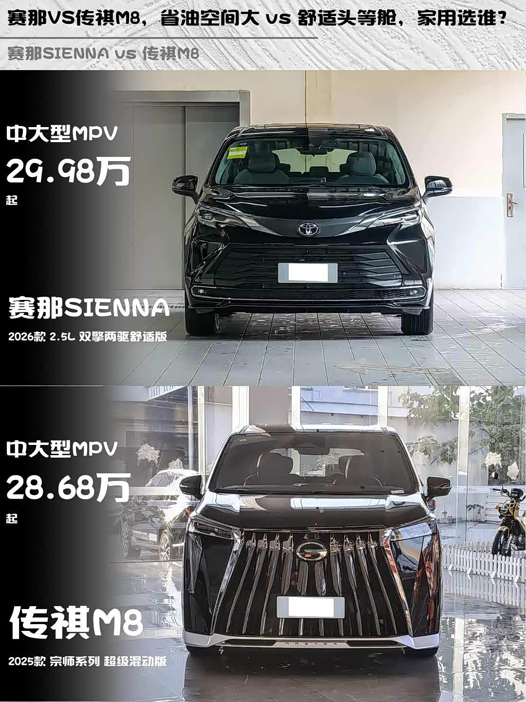 最近在选家用MPV的朋友看过来!今天深度对比两款热门混动MPV—— 赛那SIENNA(参数|询价) 2026款 2.5L双擎两驱舒适版和传祺M8 2025款宗师系列超级混动版,看完这篇你就知道哪款更适合你!✨