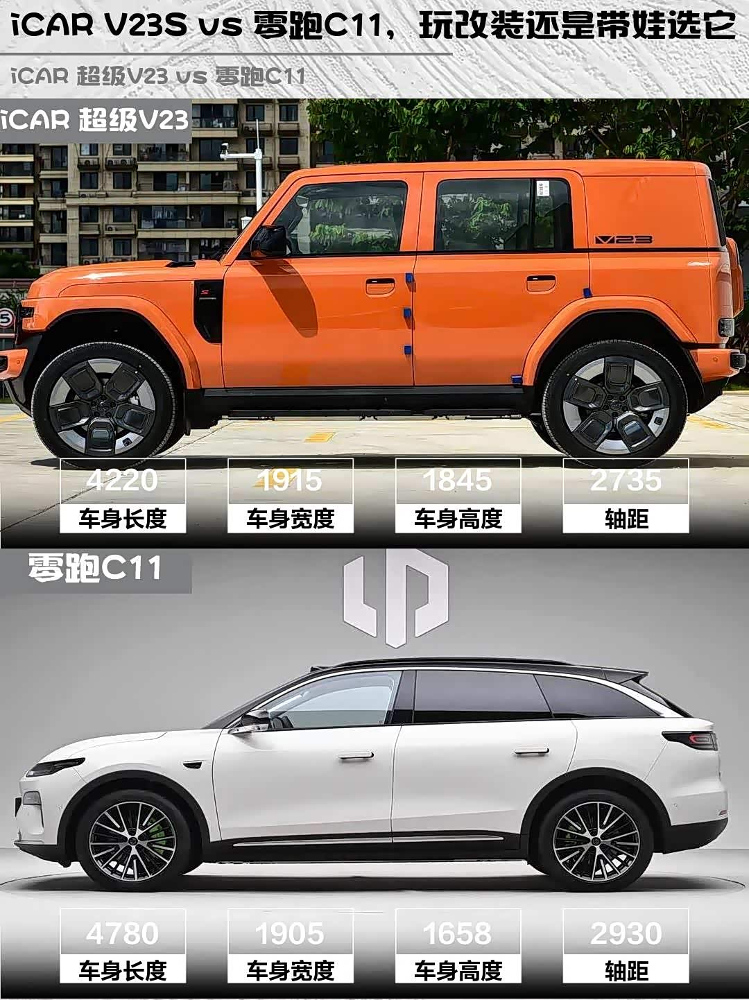 iCAR V23S的硬核造型太吸睛了!4220mm的短车身配上265mm宽胎,活脱脱电动小G既视感😎 实测开上路10分钟就有3波人摇窗问车。零跑C11则是标准中型SUV身材,4780mm车长+无框车门走的是优雅路线,贯穿尾灯夜间辨识度拉满。喜欢个性选V23S,追求稳重选C11准没错。
