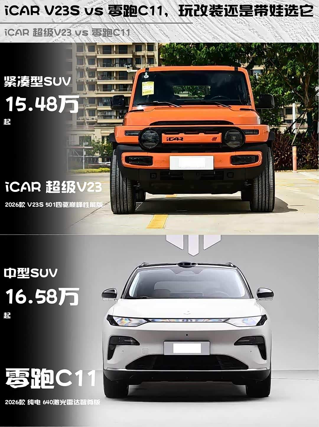 最近深度试驾了两台15万级纯电SUV的顶配车型—— iCAR 超级V23(参数|询价) 2026款 V23S 501四驱巅峰性能版和零跑C11 2026款 纯电 640激光雷达智尊版,发现这两台车完全是两种性格!纠结选车的朋友一定要看这篇实测对比👇