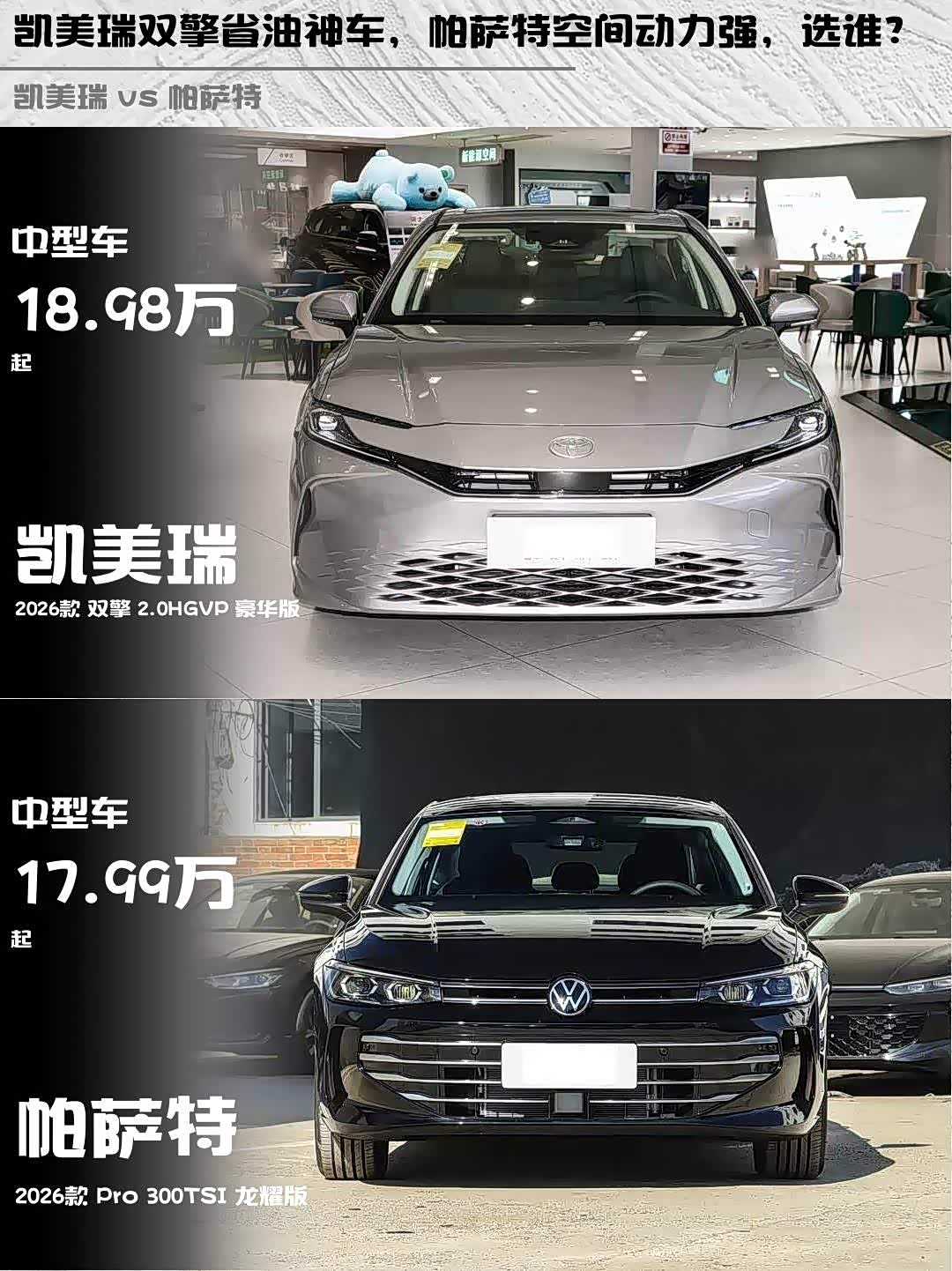 最近后台好多兄弟在问 凯美瑞(参数|询价) 2026款 双擎 2.0HGVP 豪华版和帕萨特 2026款 Pro 300TSI 龙耀版怎么选🤔 作为深度体验过两台车的过来人,今天直接上干货对比!